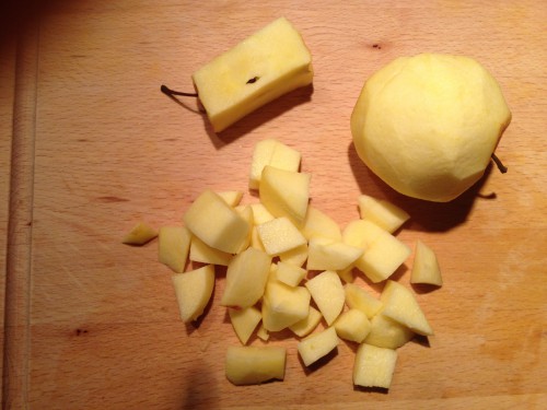 1. Backofen auf 200 Grad vorheizen, Äpfel schälen und in Würfel schneiden. Ich persönlich mag gerne etwas größere Apfelstücke hinterher im Teig, aber man kann sie auch ganz fein würfeln.
