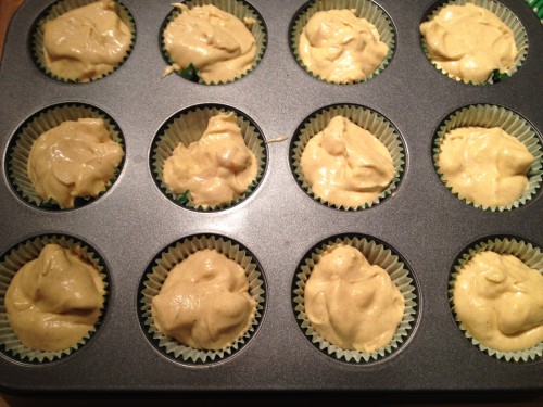 4. Nun die Apfelstückchen unterheben und das Ganze in Papierförmchen auf dem Muffinblech verteilen. Ich mag gerne farbige Förmchen dazu, weil der Teig und das Frosting ja farblich eher unspannend sind 🙂