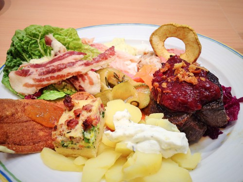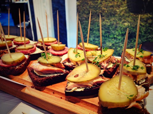 Bei den Norwegern gab es verschiedenste kleine Häppchen, alle unheimlich lecker. Elch, Rentierfleisch und Lachs waren da noch die gewöhnlichsten…