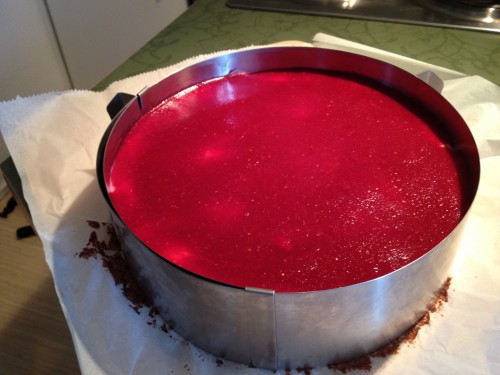 6. Die Gelatine nach Packungsangabe auflösen. Ich mache das eigentlich immer in der Mikrowelle (die ausgedrückte, eingeweichte Gelatine mit wenigen EL Wasser in der Mikrowelle schmelzen, dauert etwa 30 Sekunden). Einen EL der Himbeermasse zur aufgelösten Gelatine geben, das Gelatine-Himbeer-Gemisch dann in die restliche Himbeermasse rühren.