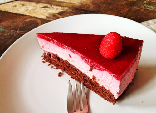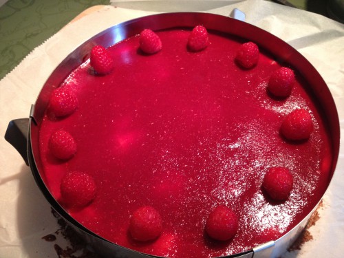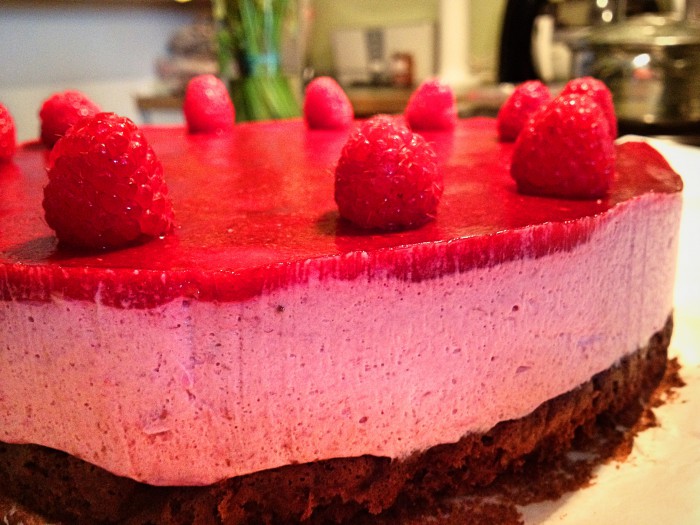 9. Mit frischen Himbeeren garnieren und mit einem scharfen Messer vom Tortenring lösen. Genießen!