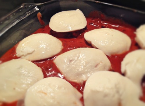 6. Den Mozzarella in dünne Scheiben schneiden und auf den Bällchen verteilen. Nun ab in den Ofen für 20-25 Minuten.