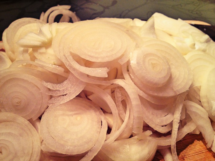 1. Zuerst das Nervigste: Die Zwiebeln schälen und in Ringe schneiden. Wenn man das geschafft hat ohne die Küche vollzuheulen, ist der Rest easy.