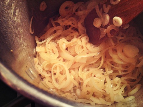 2. Die Zwiebeln in einem großen Topf in der Butter bei mittlerer Hitze anbraten, bis sie hellbraun sind. Das dauert ein paar Minuten.