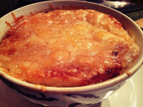 7. Sehr lecker diese Zwiebelsuppe. Man kann sie auch gut mit Gemüsebrühe machen (ich hatte Vegetarier zu Gast). Die Toastscheiben habe ich übrigens vor dem Überbacken geviertelt und auf die Suppe gelegt, damit man es besser essen konnte (sonst hätte es ein Gematsche in der Suppe gegeben).