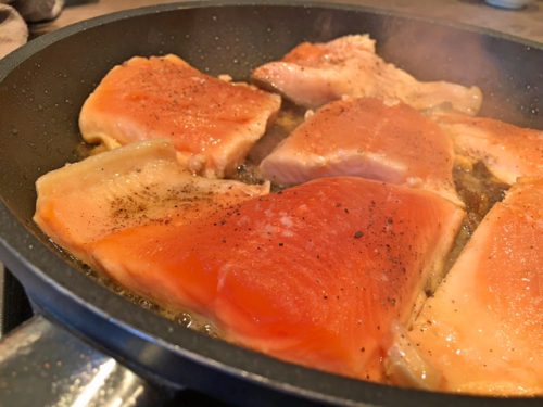 6. In einer zweiten Pfanne etwas Butterschmalz + etwas Olivenöl erhitzen. Bei nicht ganz hoher Temperatur (bei mir 7 von 9) den Fisch auf der Hautseite anbraten.