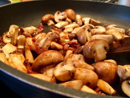 4. Die Pilze mit in die Pfanne geben und ab und an durchrühren, bis sie fast für euch „fertig“ sind- der eine mag das etwas roher, der andere ganz weich)