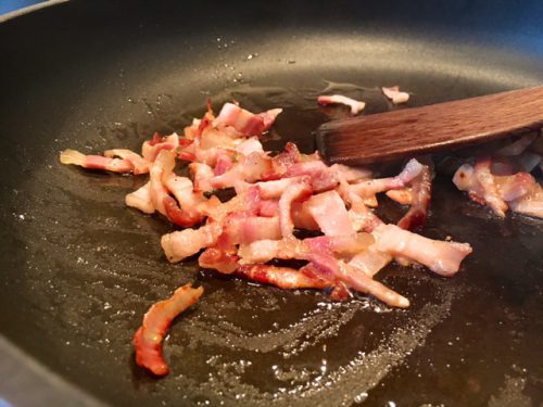 3. Zuerst den Speck ohne oder mit ganz wenig Fett in der Pfanne anbraten.