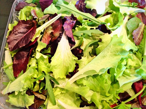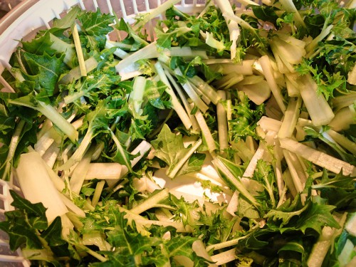 Nachdem ich festgestellt hatte, dass momentan wirklich jeder Gemüsestand dieses seltsam aussehende Kraut im Angebot hat, musste ich einfach zugreifen. Die Verkäuferin erklärte mir, wie sie es zubereitet: kleinschneiden, kochen, eine Mehlschwitze herstellen und das Kraut mit Kartoffeln hinein geben und zu einer Art Eintopf kochen. Das klang schon mal lecker. Als ich zu Hause dann mal –todesmutig– einfach reinbiss, war ich mir aber sicher: da geht noch mehr! Der Geschmack war superknackig, etwas nussig und kaum bitter… Gaaanz grob wie Chicorée, aber weniger bitter. Und eben ein bisschen nussig. Und ein bisschen scharf, wie Kresse! Lecker! Da war auch gleich die Idee geboren: Ein Salat soll es werden!
