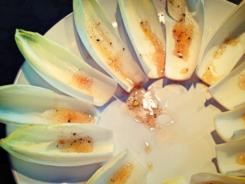 2. Die Zutaten für das Dressing gut miteinander vermengen. Ich schüttel sie immer in einem Marmeladenglas :-). Dann schon einmal einen Esslöffel des Dressings auf die Chicoréeblätter geben.