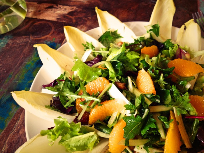 Da Chicorée und andere nussige Wintersalate gut mit Orangen harmonieren, hab ich mich mal in meinem Rezeptfundus umgeschaut. Dabei bin ich auf ein altes Weightwatchers-Rezept gestoßen, das mir als Basis ganz geeignet schien– ein bisschen dran herumgebastelt und fertig ist ein superleckerer Wintersalat, der vor Vitaminen nur so strotzt. Wer mag, kann dazu ein Hähnchenfilet oder ein Stück Lachs braten –mir hat ein richtig leckeres Brot gereicht. Ich habe bewusst ein sehr kalorienarmes Dressing gewählt. Wer es etwas reichhaltiger möchte, fügt mehr Olivenöl hinzu und dafür weniger Gemüsebrühe.