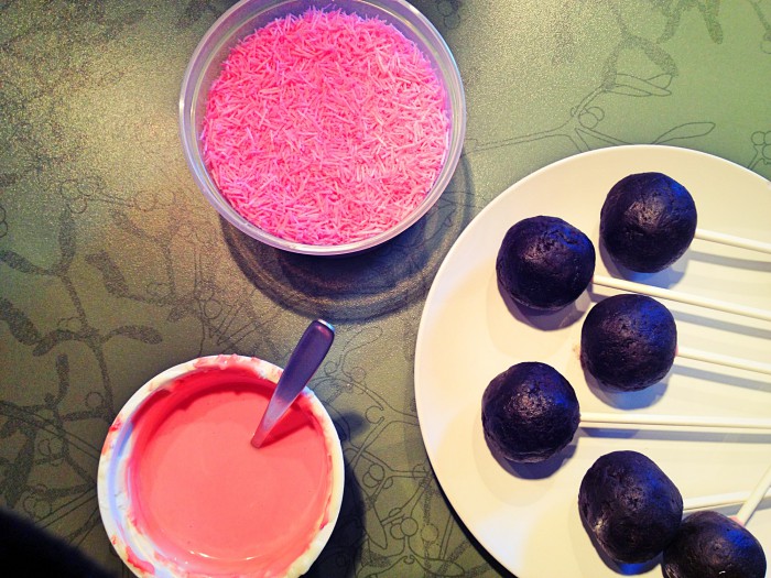 4. Die Glasur und die Candy Melts zusammen schmelzen und zu einer rosafarbenen Kuvertüre verrühren. Mit den Lollistielen zuerst ein Loch in die Kugeln stechen, sie dann in die Kuvertüre tauchen und anschließend die Kugeln damit aufspießen. Die Lollis jetzt liegend nochmal 30 Minuten kühlen.