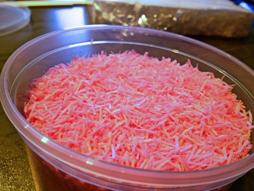 Schnipsel aus Esspapier. In allen Farben. Ich hatte zwar noch keine Idee, was ich genau damit machen wollte, aber die Dinger wurden sofort gekauft. Liebe Kollegen, falls ihr das hier lest: keine Sorge, ich habe nicht den gesamten Gutschein in Esspapier umgewandelt ;-). Ein Topf kostet 2,50 € und da ist wirklich ’ne Menge drin!
