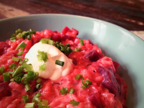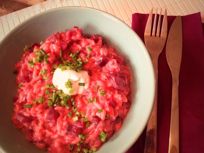 Heute habe ich für euch ein rosarotes Risotto – mit roter Bete, Ziegenkäse und Parmesan. Klingt im ersten Moment ein bisschen schräg, ich weiß, aber es schmeckt superlecker! Wer Ziegenkäse partout nicht mag oder ausprobieren möchte, kann auch normalen Frischkäse nehmen.