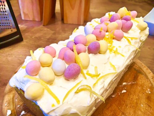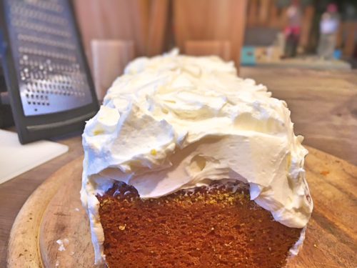 9. Die Creme nach Belieben auf dem Kuchen verteilen- wird sehr üppig. Nach Geschmack mit Zitronenzesten und anderer Deko verschönern.