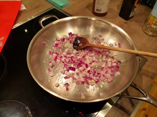 Am nächsten Morgen frisch ans Werk- und ans Gerät. Bis mir die Augen zufielen hatte ich am Vorabend Artikel über Artikel gelesen über Taktiken des „zuerst erhitzen, dann runterstellen“, Wassertropfentest, Bratgut bloß nicht anfassen bis es sich von selbst löst und, und, und….was soll also schief gehen? Und sie alle sollten Recht behalten- mein Freund mit der grandiosen Erklärung „Das muss funktionieren“, denn „bei Kitchen Impossible würden in den meisten Küchen schließlich auch nur Edelstahlpfannen oder gusseiserne Pfannen stehen“, die vielen Kochverrückten aus den Foren, die den Wassertropfentest erklärt hatten und auch der Hersteller- der zur Ruhe mahnt, es kann nichts anbrennen, wenn man ein bisschen Geduld hat. Ehrlich gesagt- es funktioniert traumhaft. Ich freue mich riesig über meinen Küchenzuwachs. Und nein- das ist keine Werbung, ich habe kein Geld für dieses Lob erhalten ;-).