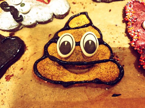 Hat gar nicht funktioniert: Mich weniger aufregen, wenn bei der Arbeit irgendwer quer schießt. Aber immerhin- als ich neulich mit einer gehörigen Portion Grummeln im Bauch nach Hause kam, war mein Freund schon früher angereist und hatte mir eine Ladung „Kackhaufen-Kekse“ gebacken, die ich dann bei einem Glas Weißwein dekoriert habe. Wer kann schon noch wütend sein, wenn er diese süßen Haufen vor sich hat? 😉