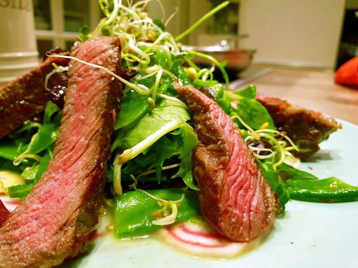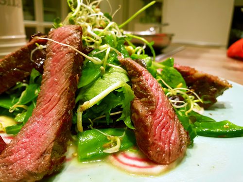 9. Das Steak aufschneiden und die Schneideflächen nochmal mit etwas Salz bestreuen. Dann zusammen mit dem Salat anrichten und genießen 🙂