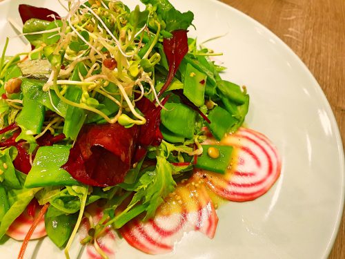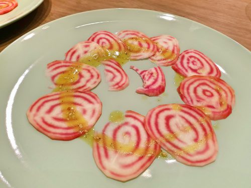 5. Die Ringelbeete schälen und in sehr dünne scheiben schneiden. Die Scheiben auf 2 Tellern anrichten und je schonmal mit 1 EL des Salatdressings beträufeln.