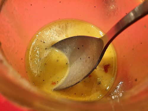 4. Für das Dressing Weißweinessig, Senf, Honig, die zerbröselte Chilischote sowie etwas Salz und Pfeffer gut vermischen. Ich nehme dazu ein Schraubglas und schüttele kräftig. Dann das Olivenöl zugeben und nochmal kräftig schütteln. Abschmecken- genug Salz und Pfeffer? Ruhig mal mit nem Salatblatt testen. In diese Soße kommt eigentlich noch 1 EL Sesam. Ich finde aber, dass der mir den anderen starten Geschmacksrichtungen, etwas untergeht Man kann ihn also auch ruhig weglassen.