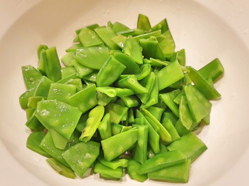 2. Die Zuckerschoten in mundgerechnet Stücke schneiden und in kochendem Salzwasser rund 2 Minuten bissfest garen. Dann abgießen und mit kaltem Wasser gut abschrecken, so dass sie nicht weitergaren und schön knackig grün bleiben.