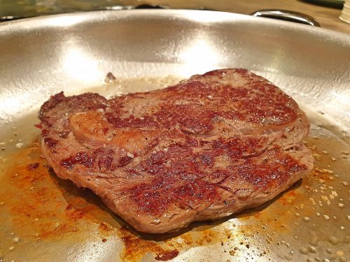 7. Das Steak in einer Pfanne von beiden Seiten knusprig anbraten und mit Salz und Pfeffer würzen. Meine Pfanne habe ich erst voll aufgedreht, dann das Öl rein und die Pfanne auf 6 von 9 zurückgedreht. Dann dauerte das Anbraten etwa 7 Minuten, bei 2 cm Dicke. Das Steak dann in Alufolie wickeln und einige Minuten ruhen lassen. In der Zeit kann man die Küche schonmal etwas aufräumen 😉