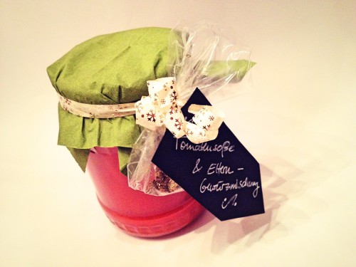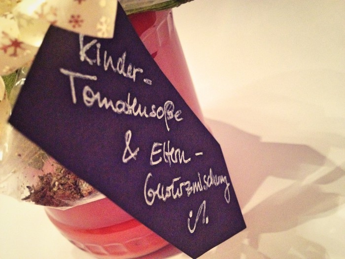 Eine fruchtige Tomatensoße, die Kindern ebenso schmeckt wie Erwachsenen – gar nicht so einfach! Die Nichte und der Neffe meines Freundes sind jetzt 2 und 4 -und lieben natürlich Tomatensoße, die möglichst fruchtig, ein bisschen süßlich und weder scharf noch zu würzig schmeckt. Für Erwachsene kann das auf die Dauer wirklich mehr als fade sein – im Urlaub wurde ihnen deshalb sprichwörtlich „ein eigenes Süppchen“ gekocht – was mich auf eine interessante Idee für ein kulinarisches Geschenkt aus der Küche brachte: eine Kindersoße mit Erwachsenen-Gewürzmischung als kleines Add-on.
