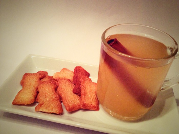 Weißen Glühwein kennt ja mittlerweile fast jeder. Dieser ist noch aromatisiert mit Apfelsaft und Cointreau- also eigentlich mehr Punsch. Dazu ein bisschen Ingwer und Zimt… Mmmhhhhh. Und bestimmt gut gegen Erkältung. Oder so.