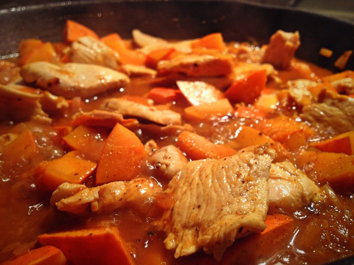 4. Nach 5 Minuten das Fleisch wieder hinzugeben und mitköcheln lassen, weitere 5-10 Minuten auf dem Herd lassen, bis der Kürbis eine angenehme, aber bissfeste Konsistenz hat.