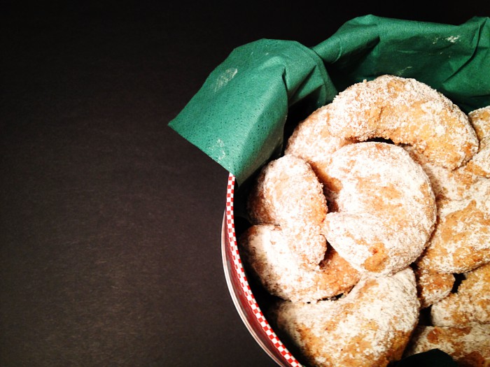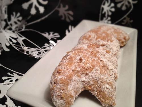 7. Nach dem Herausnehmen sind die Kipferl noch etwas weich. Einfach einen Moment noch auf dem Blech liegen lassen. Sobald sie fest genug sind, dass ihr sie hochnehmen könnt (und euch so graaaade nicht mehr die Finger dran verbrennt) nehmt ihr sie und zieht sie einzeln durch das Puderzucker-Zimt-Gemisch. Sie müssen dazu aber wirklich noch sehr warm sein, sonst bleibt der Zucker nicht so schön kleben.
